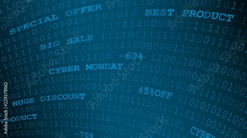 Cyber monday background of zeros, ones and inscriptions in blue colors