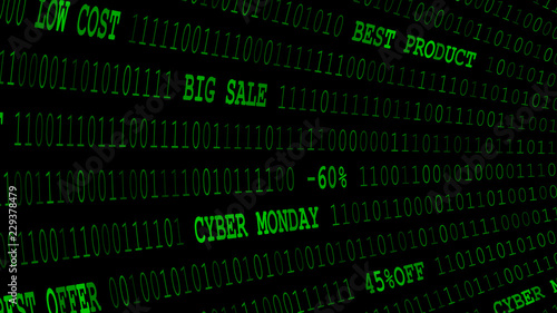 Cyber monday background of zeros, ones and inscriptions in dark green colors