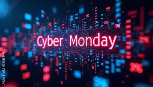 Cyber Monday glowing digital numbers background with percentage symbols