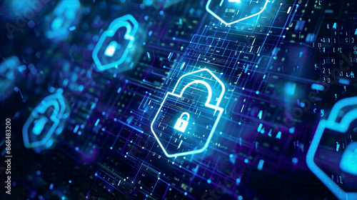 Cyber security and information security concept encryption symbols and secure access icons protecting user's personal information and secure Internet access on a blue digital background