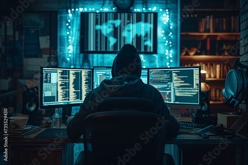 Cyber security concept, A hacker clad in a hoodie is immersed in work, with multiple computer screens displaying lines of code, in a dimly lit room that suggests cyber secrecy.
