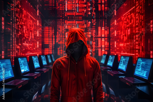Cyber security concept. Hacker in red, standing in front of computers with red code in background scary looking, futuristic.