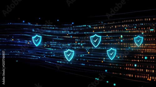 Cyber security data protection business technology background showing checked shields over binary code flow transferring digital information for internet security and protection of sensitive data
