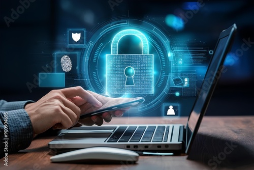 Cyber security, data protection concept. User using mobile phone and laptop computer with privacy security and data encryption system, secure internet access. Cybersecurity software technology protect