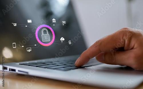 Cyber security network. Data protection concept. Businessman using laptop computer with digital padlock on internet technology networking with cloud computing and data management, cybersecurity