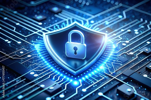 Cyber Security Shield on Computer Circuit Board Background. Data Protection, Firewall, Network Security System. Digital Data Encryption, Security Technology Concept