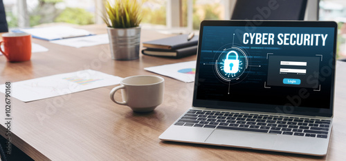 Cyber security system on computer screen protect private information snugly from hacker and cyber attack