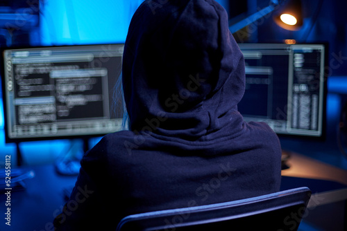 cybercrime, hacking and technology concept - close up of hacker in dark room writing code or using computer virus program for cyber attack