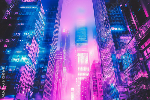Cyberpunk Urban Environment with Tall Skyscrapers and Dynamic Neon Light Effects
