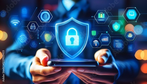 Cybersécurité, verrou et bouclier apparaissant au dessus d'un téléphone smartphone entre les mains d'un homme