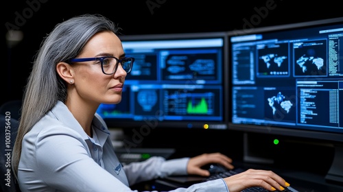 Cybersecurity Analyst at Work: Focused female professional monitoring digital security systems on multiple screens. A portrait showcasing dedication, expertise, and technological prowess.