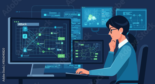 Cybersecurity analyst inspecting a network attack interface on multiple screens