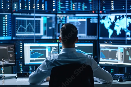 Cybersecurity analyst monitoring network security from a command center