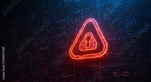 Cybersecurity and digital risk alert, a red neon warning triangle symbol with a padlock icon on an electronic circuit board background, indicating danger, malware threat, or data breach