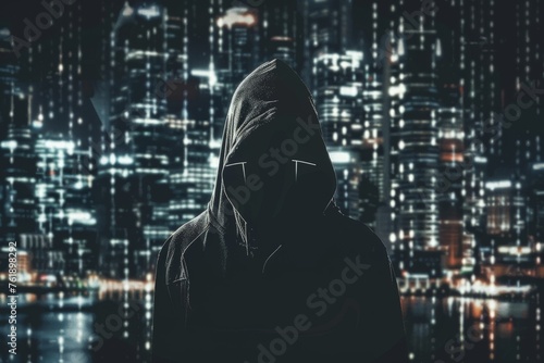 cybersecurity and hacker, Computer hacker in mask and hoodie over abstract binary background