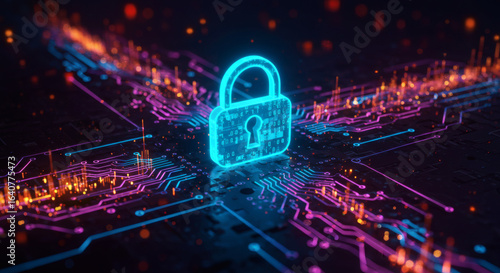 Cybersecurity Concept: Glowing Blue Lock Icon on Futuristic Circuit Board with Data Streams, Digital Security and Technology