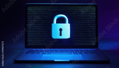 Cybersecurity concept: lock symbol on laptop screen with binary code