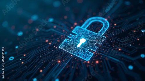Cybersecurity concept with digital padlock on circuit board representing data security and technology protection