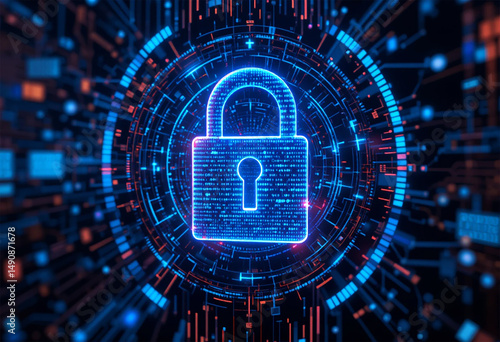 Cybersecurity concept with glowing digital lock and tech background.