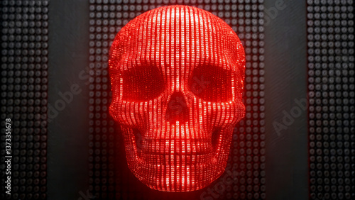 Cybersecurity Data Breach Financials concept. Digital skull design with binary code, illuminated in red against a dark background.