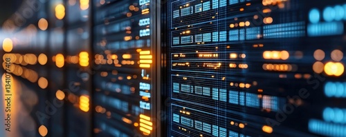 Cybersecurity data protection in database computing concept. Modern server rack with glowing data connections and lights.