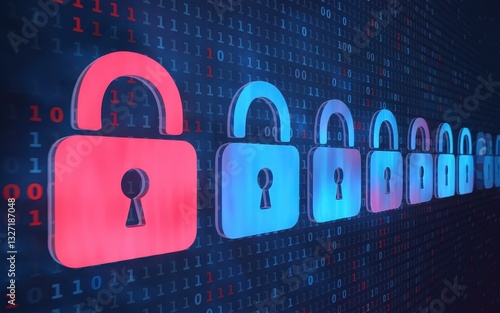 Cybersecurity: Digital Lock Icons in Binary Code Background