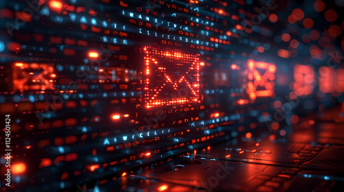 Cybersecurity Email Alert: Glowing digital email symbols embedded in a futuristic binary code wall. A striking visual metaphor for digital security and data protection.