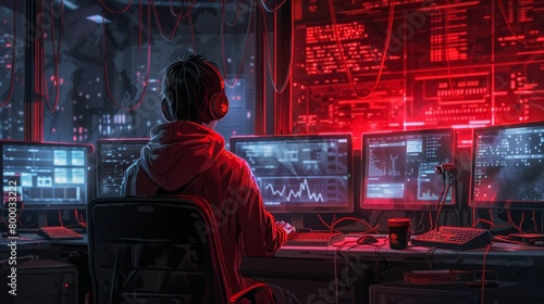 Cybersecurity expert in a dark control room, red lighting highlighting focus, ample copy space
