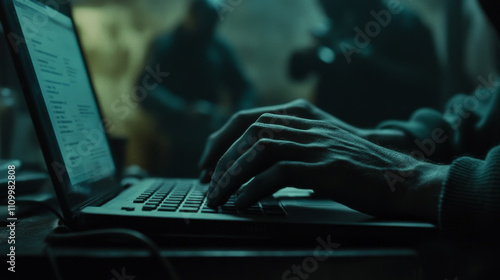 Cybersecurity Hacker Typing on Laptop, Dark Background, Surveillance