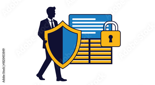 Cybersecurity man with shield protecting data and network security