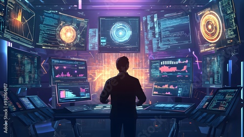Cybersecurity professional analyzing artificial intelligence and machine learning data on multiple computer screens, emphasizing network security, firewall management, and cutting-edge technology