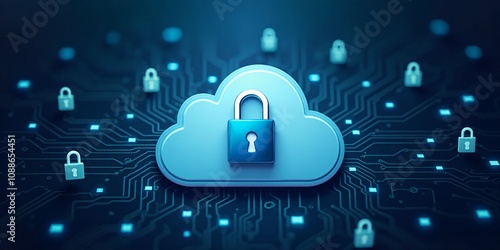 Cybersecurity Secure Cloud Storage, A cloud icon surrounded by locks and circuits, with copy space.