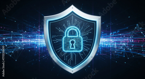 Cybersecurity Shield Icon with Digital Lock and Data Protection Background