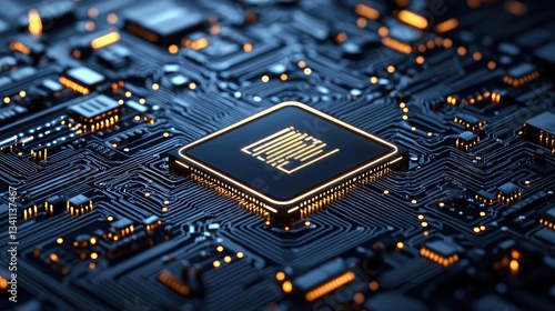 Cybersecurity technology in computing and database concept. Close-up of a computer microchip on a circuit board.