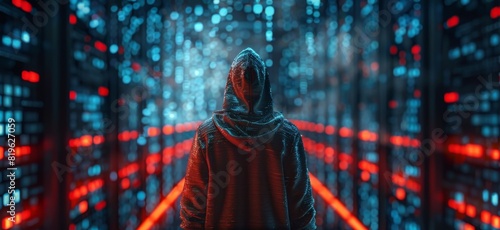 Cybersecurity vulnerability hacker, coding, malware concept. Hooded computer hacker in cybersecurity vulnerability Log4J on server room background. metaverse digital world technology