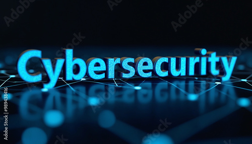 Cybersecurity Word with Digital Network: The phrase Cybersecurity within a connected digital network, representing online security, data protection, and tech infrastructure.