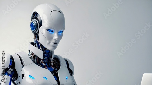 Cyborg female robot android working on laptop on white background