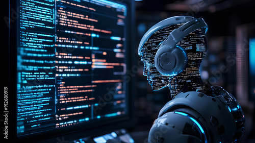Cyborg working on computer program code. Artificial intelligence concept. 3D Rendering