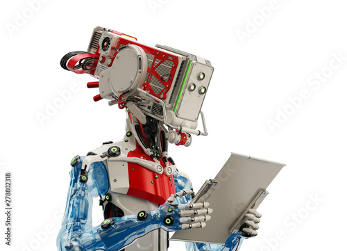 Cyborg working with digital tablet, 3d illustration