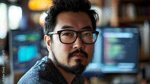 Daily coding session at dual monitors in office. Asian male developer portrait. Programmers Day