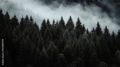Dark Forest Silhouettes Emerging Through Fog