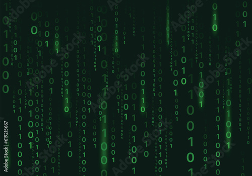 Dark green gradient unit program code vector background. Binary matrix and falling numbers on a dark background vector illustration.