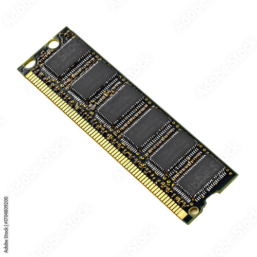 Dark rectangular computer RAM module with gold contacts