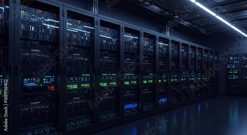 Dark server room filled with rows of computer servers, illuminated by glowing lights.