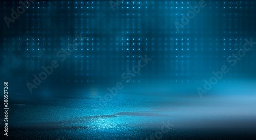 Dark street, wet asphalt, reflections of rays in the water. Abstract dark blue background, smoke, smog. Empty dark scene, neon light, spotlights. Concrete floor