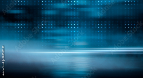 Dark street, wet asphalt, reflections of rays in the water. Abstract dark blue background, smoke, smog. Empty dark scene, neon light, spotlights. Concrete floor