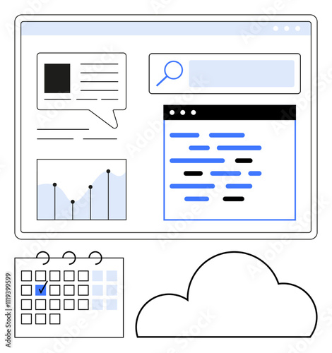 Dashboard screen with a graph, chat bubble, search bar, coding window, calendar, and cloud symbol. Ideal for project management, software development, data analysis productivity tools team