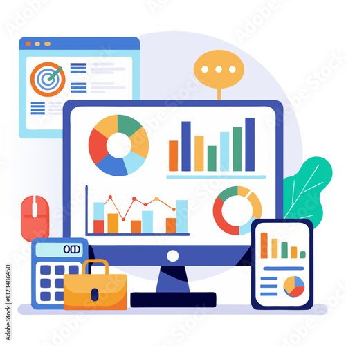 Dashboards present real time business metrics through colorful graphs and charts. A computer and device display critical data for monitoring performance and decision-making