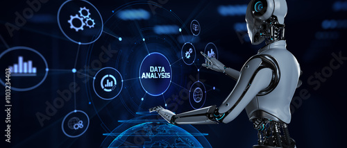 Data analysis analytics big data business intelligence technology concept. Robot pressing button on virtual screen. 3d render.