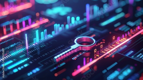 Data analysis chart, white system monitoring interface, key icon, front view, highlights secure connection, digital binary as object, colored pastel
